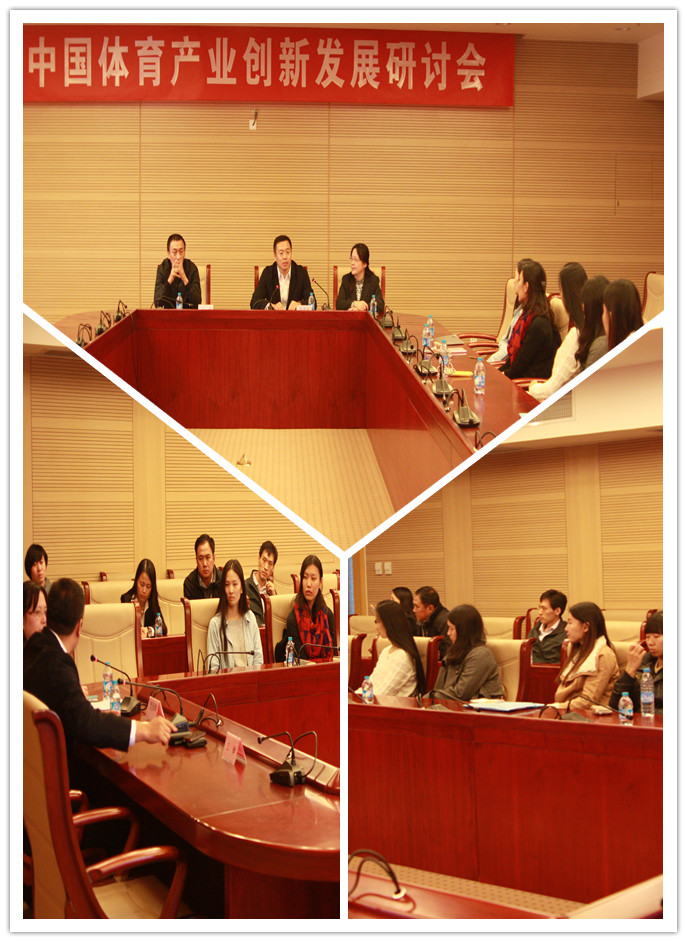 在圆桌会议阶段,刘扶民司长、王平副社长、田长波主席,知名企业家代表活跃传媒集团董事长兼CEO张博涵、奥力来康体设备有限公司总裁夏荣鹏、北京关键之道体育咨询有限公司总裁张庆等人围坐在一起,分别从政府,企业,学术三个角度畅谈了与体育产业发展现状及其制约因素、体育产业创新模式、体育产业发展与人才需求等有关的话题,发表了各具特色的独到见解。在研讨会互动阶段,嘉宾们回答了在场师生提出的问题,并鼓励同学们大胆创新,勇于实践。