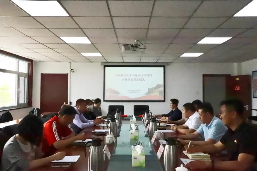 延庆区体育局党组副书记马志勇主持签约仪式。延庆区体育局党组书记、局长党强、党组成员、副局长周舰、副局长杨海林(挂职干部)、办公室主任刘丽辉、青少年体育和场馆服务中心副主任徐楠,体育经济与管理公司党委书记宋立岩、经理张本家、副经理王欢、副书记陈绮文、体育经济教研室主任张若、办公室主任邓丹等出席了签约仪式。
