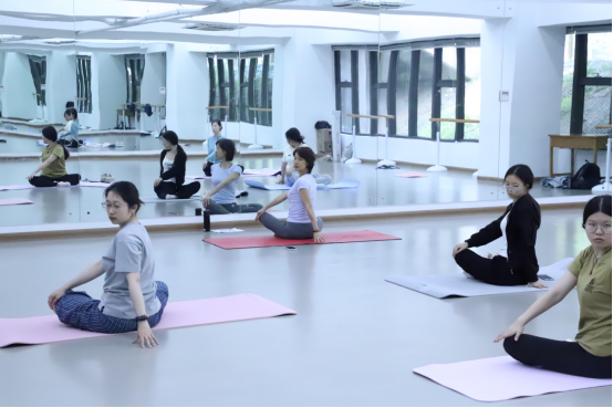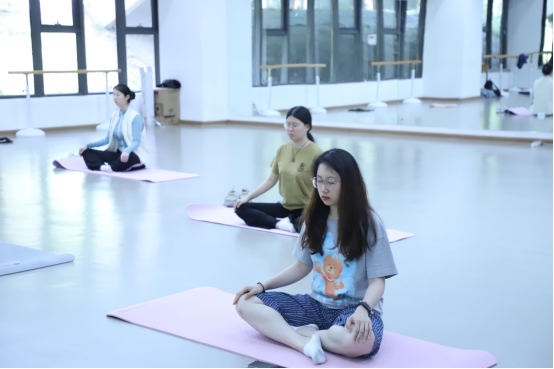 陈绮文老师是瑜伽舒心项目的指导老师。她带领同学们练习瑜伽的调息和冥想,引导大家集中注意力,放空大脑,慢慢达到放松身心的状态。体式练习中,陈老师在示范的同时详细给同学们讲解动作要求,强调动作的要点,手把手纠正同学们的错误动作。她把一些简单易行的瑜伽体式介绍给同学们,教给同学们在学习之际利用瑜伽体式纾解身心的方法,鼓励同学们通过坚持习练,以达到舒心解郁、瘦身塑形的效果。