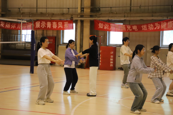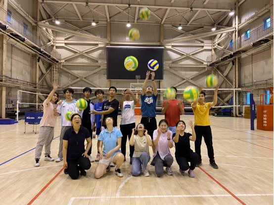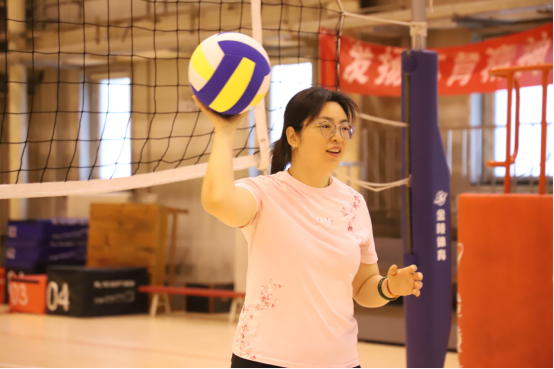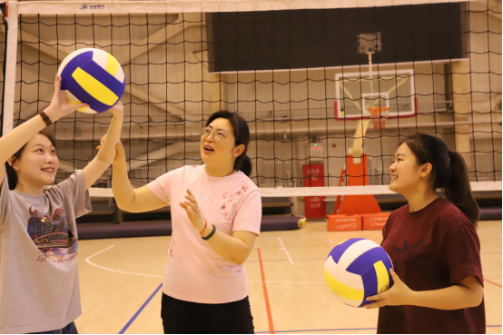 黄丽娜老师是气排球减压项目的指导老师。她采用寓教于乐的方式,让同学自由练习垫球,团队成员之间相互配合,保证不要让球落地。黄老师加入同学们之中,边垫球边观察,教同学们如何把握接球时机、如何控制球的反弹方向。同学们很快融入其中,体验到了软式排球的乐趣。
