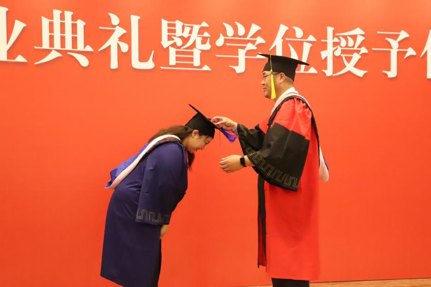 学位授予仪式的环节。张丛杉副经理宣读毕业生学位授予名单,张本家经理为毕业生们拨穗授予学位并颁发毕业证、学位证。