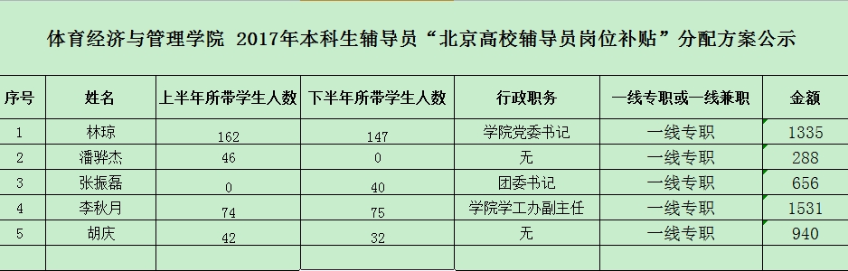 根据《关于做好2017年本科生辅导员“北京高校辅导员岗位补贴”发放工作的通知》和《PA视讯官方网站“北京市辅导员岗位补贴”发放办法》(校发〔2009〕117号)制定公司发放方案。公示期间如有异议请与PA视讯员工工作办公室联系。