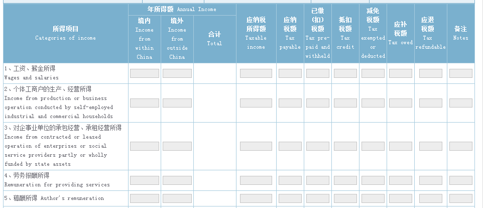 3.一般情况下,在公司取得的收入部分需要填写“工资、薪金所得”项目中“年所得额(境内)”、“应纳税所得额”、“应纳税额”、“已缴(扣)税额”等四项,其他项目为均为“0”。其中:(1)年所得额(境内)=工资项“应纳税所得额”+个人酬金“发放金额”;(2)应纳税所得额=年所得额(境内)-3500*本年度领取工资的月数(一般情况下为12个月)。外籍人员应纳税所得额=年所得额境内所得-4800*本年度领取工资的月数;(3)应纳税额=已缴(扣)税额=工资项“个人税”+个人酬金“扣税金额”