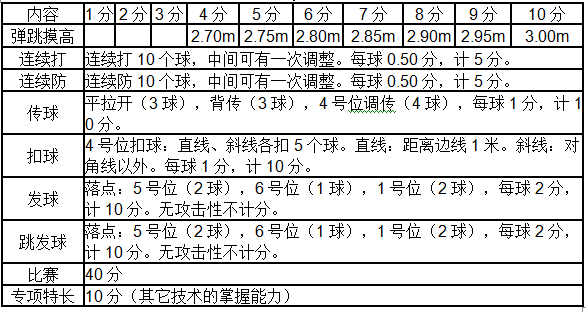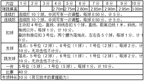 女排攻手队员评分标准:满分100分,具体标准见下表。