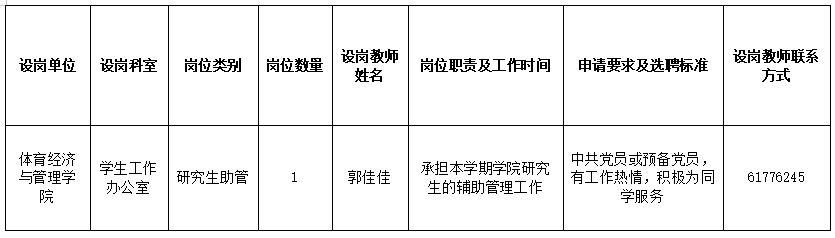 下表是2023-2024学年第一学期“三助一辅”设岗情况,请有意向申报的研究生根据公布的联系方式自行联系设岗教师,设岗老师在9月20日前完成选聘工作。