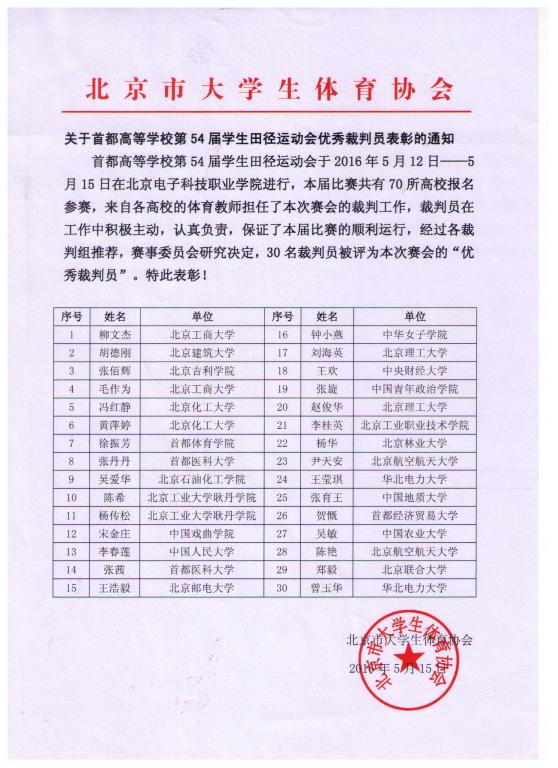 公司王欢老师被评为首都高等公司第54届员工田径运动会“优秀裁判员”