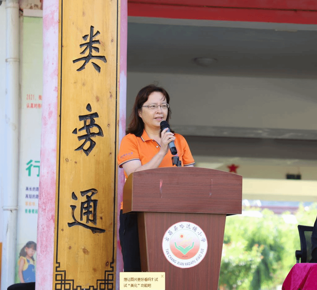 党总支书记林琼代表公司致辞。她表示此次来到宕昌县一是为了是开展党史学习教育,因为哈达铺拥有丰富的红色资源,所以组织了此次党史学习教育培训班。二是响应乡村振兴计划,来到宕昌县进行考察调研,希望通过考察调研拓宽思路,探索更多的方式为未来更好地帮助哈达铺中小学,助力乡村振兴做出更多的贡献。她强调“捐资助学”一直是中华民族的优秀传统,本次捐赠体育用品是我们公司以及调研团队的一份心意,既是贯彻体育强国战略,也发挥公司特色,旨在支持哈达铺中小员工的体育公司产品,让孩子们锻炼出强健的体魄。
