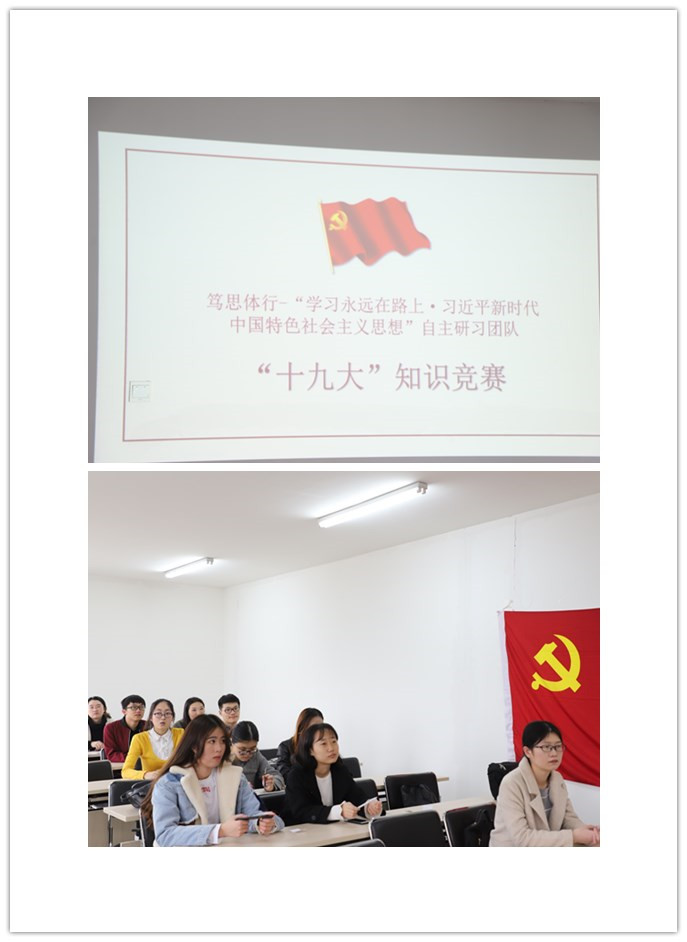 本次十九大知识竞赛形式新颖,同志们积极参与其中,巩固了学习十九大报告内容的成果的同时了解了校史校情等知识;竞赛形式也有助于每位同志认识到在理论知识方面的不足和未来努力方向,进而进行有针对性的学习和改进;同志们在竞赛过程中展现了团结协作的精神和敢于批评指正的意识。