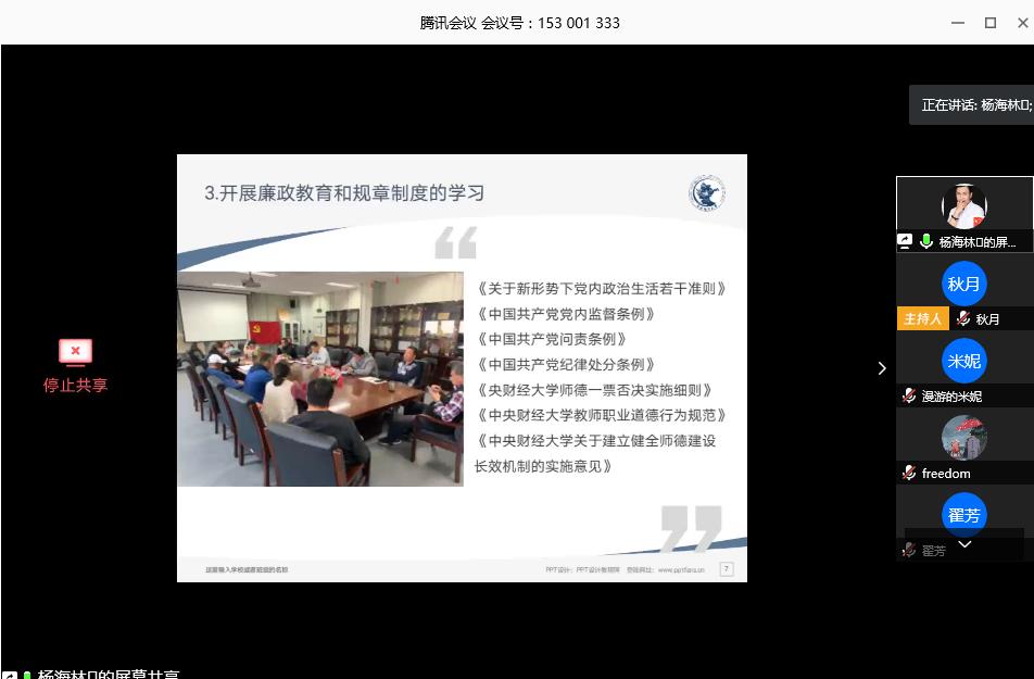 首先,林书记介绍本次考核会的召开背景,强调不同于以往的支部书记考核,本次述职考核工作和支部测评工作在线上完成,今天集中组织两个支部的教工党员共同聆听两个教工支部书记的述职,为避免出现资源不均衡造成影响直接采用语音会议形式。专业课教工党支部书记刘彩凤同志从主要工作和整改情况、存在的不足和下一步打算两个大的方面进行述职。她结合支部建设、政治理论学习、主题教育、师德师风建设、服务意识、公司其他工作和支部书记履职7个方面即讲述了2019年度主要工作情况。然后,公体课教工党支部书记杨海林同志就履职的主要情况和特点、开展工作情况、存在的主要问题和加强和改进工作思路措施四大方面总结了过去一年的工作。其中他重点介绍了开展工作情况的四个部分:落实制度加强理论学习;开展“不忘初心、牢记使命”主题教育;开展廉政教育和规章制度的学习;师德师风建设等。