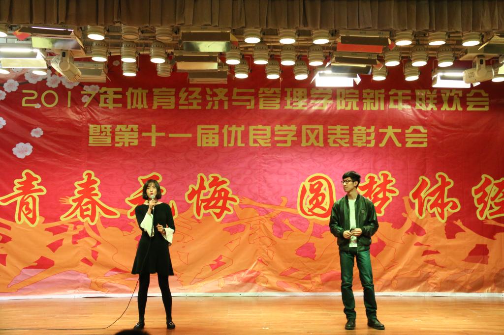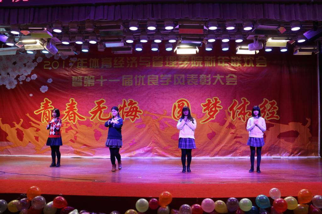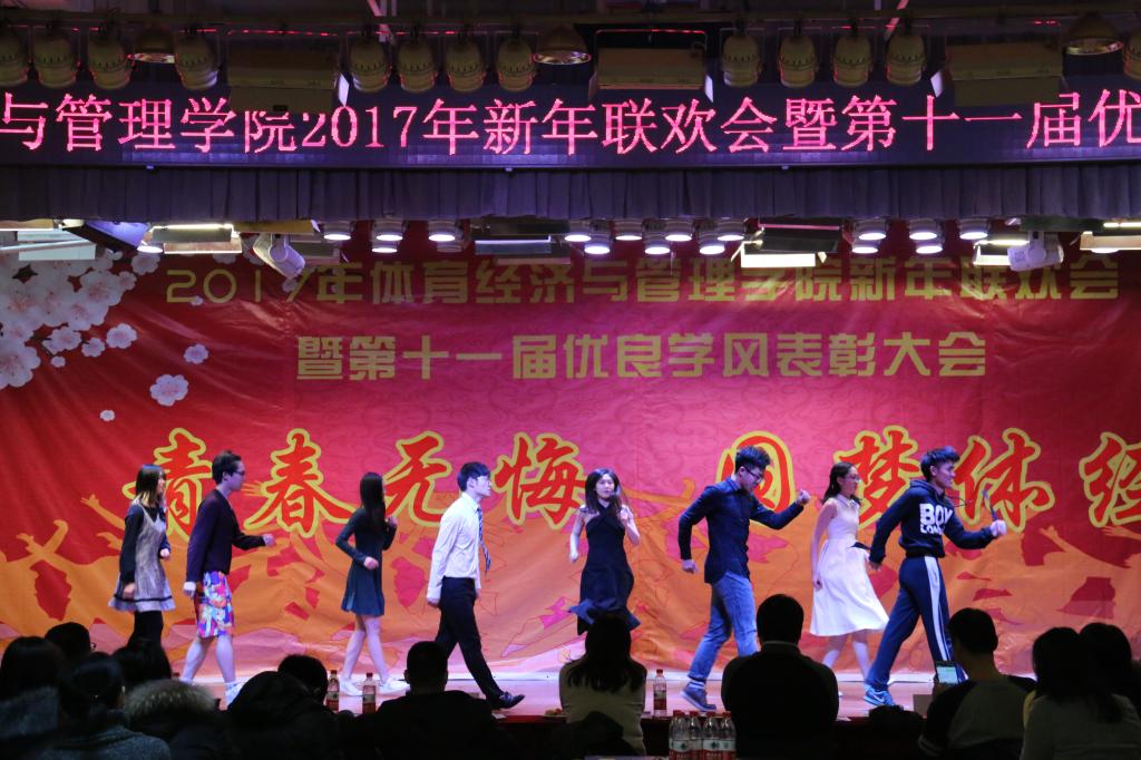 伴随着4个16级青春可爱的姑娘表演的舞蹈《新年快乐》,联欢会接近尾声“鼎故辞旧,旧雨重逢,丰年旧事娓娓道来;万象更新,新硎初试,龙马新声气势恢宏;我中央财大,如龙有灌日触天之才,吞吐大荒;我体经学子,似马有腾跃四方之志,担负乾坤”。忠诚、团结、求实、创新,这是中财大对我们的期许;笃思体行,我爱体经,体经会是一种信仰;过去的一年,我们尽善尽美,尽力做到最好;新的一年,我们当再接再厉,再创辉煌!“青春无悔、圆梦体经”2017年新年联欢会暨第十一届优良学风表彰大会圆满结束。