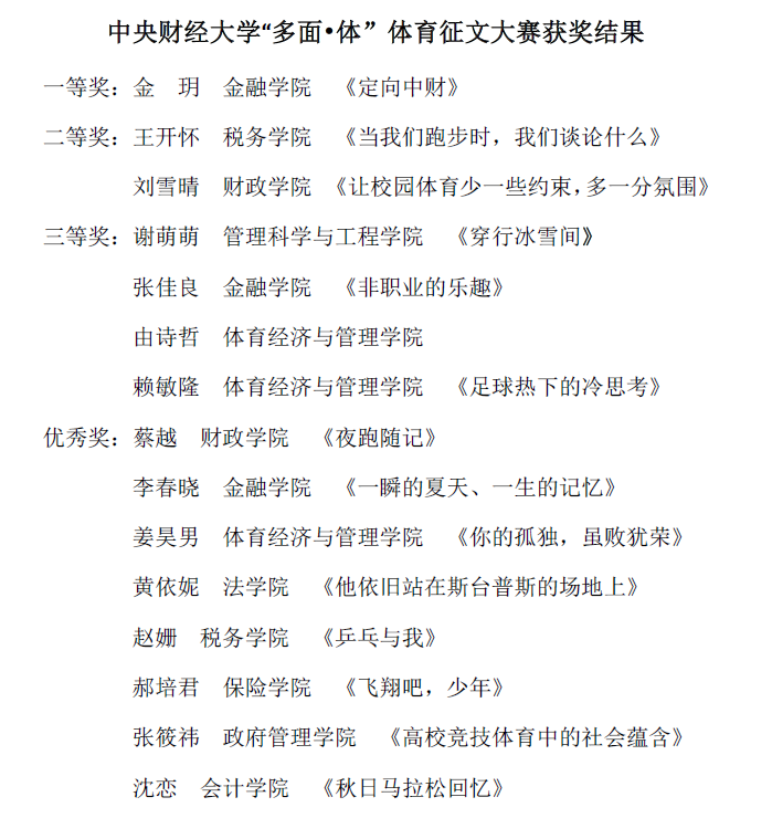 此次征文比赛不仅激发了中财学子对校园体育多维度多层次的思考,更使这份对体育的热爱根植于每位参赛者的心中,为公司推广校园体育迈出坚实的一步。