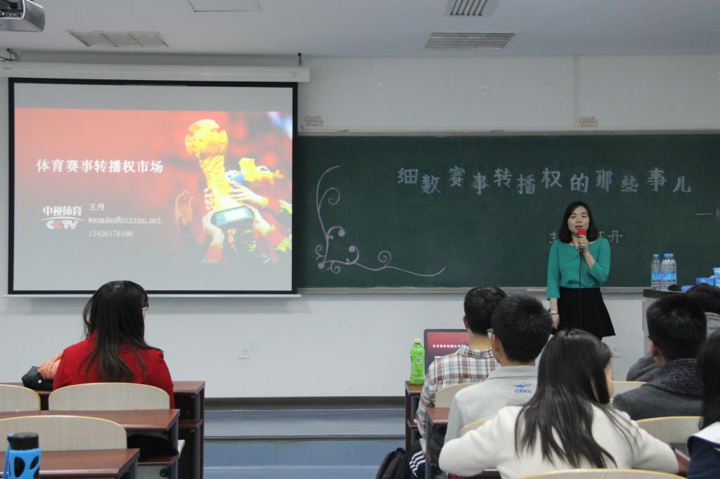 讲座开始后,王丹首先向同学们介绍了各大组织与转播权相关的收入情况,特别指出国际奥委会(IOC)、FIFA、欧洲冠军联赛的转播权收入逐年增高,且增长迅速。随后,王丹又讲述了有关转播权市场,以主体、销售方式两方面为主分析了转播权市场。其间王丹举了FIFA及英超的例子帮助同学们理解,引起了同学们的兴趣,还指出迅速崛起的付费电视台正在挤压诸如BBC等公共电视的生存空间。随后,王丹又向同学们介绍了他们比较关注的欧洲五大联赛转播权市场的收入情况及欧美市场的版权情况,并以PPTV等媒体为例向同学们讲述了国内市场的现状及发展情况,王丹指出新媒体崛起是一个趋势,新媒体也将逐渐占据国内市场的主体地位。