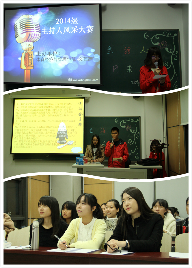 11月28日晚,由PA视讯主办的主持人风采大赛在东区主教401举行。本次比赛由公司文艺外联部主办,活动面向体经13级全体学员,报名参赛选手共有十四名,并由员工会副主席胡庆、文艺外联部部长花卉、宣传部部长杨婉愉担任评委。活动由14级1班朱旖晨主持。比赛将选出2名最佳主持人,1名优秀主持人。