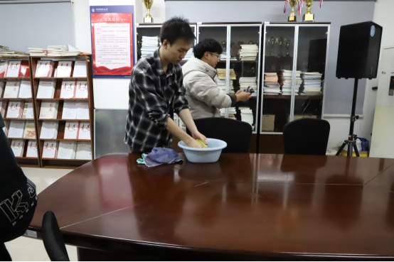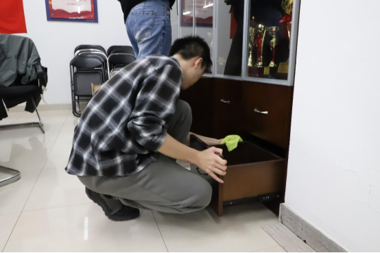 活动当晚,团员们手持清洁工具,热情洋溢地投身于公司“党员之家”的卫生清洁工作。他们分工合理,有的负责清除垃圾,有的负责擦拭桌椅,还有的负责整理公司荣誉展示柜,每个人均全力以赴,力求达到最佳效果。