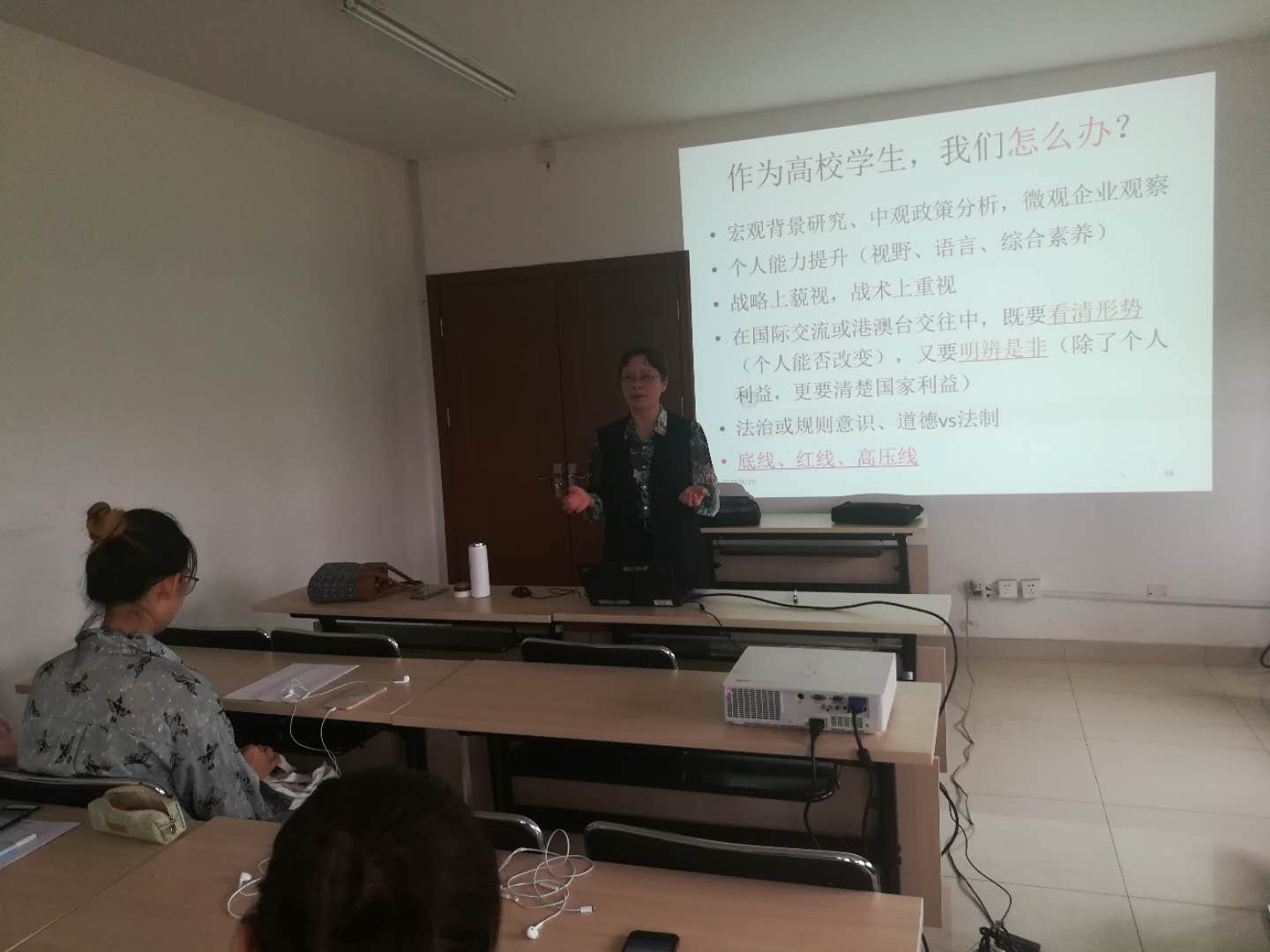 首先,林书记从“怎么看”和“怎么办”两个角度对中美贸易摩擦战进行了解读。就“怎么看”,林老师讲解把握国际形势要树立正确的“三观”:历史观、大局观和角色观,即通过回望过去,总结历史规律,展望未来;在看到现象和细节的同时要把握本质和全局;把我国摆入世界格局中看问题,弄清楚我国在世界格局演变中的地位和作用,科学制定方针和政策。接着她介绍了决定世界大势的10个基本变量,包括未改变的变量和发生改变的变量:世界经济持续在增长,但大国间力量对比发生显著变化;技术不断更新,成为一把双刃剑;网络革命,民主权利觉醒催生民粹主义等,之后还谈到了中国的国家安全、美欧渐行渐远等问题。林书记通过现实的例子帮助同学们学会从经济学的角度看问题,了解不同的思维方式,使同学对当前形势有了重新的认识。