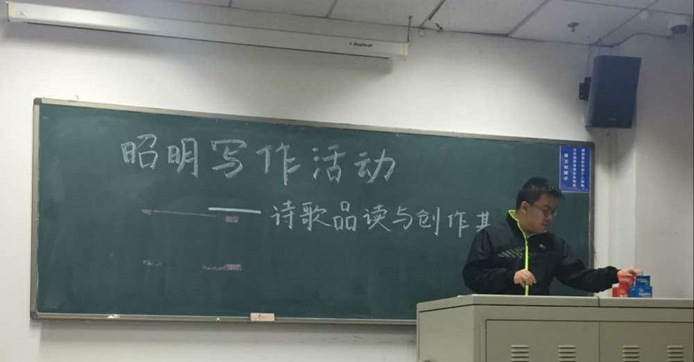 随后,主讲人让每位在座同学写下对此次活动的感想并鼓励我们亲自创作诗歌。在这期间,他即兴在黑板上写下了一首诗歌。每个同学奋笔疾书,在接下来的分享里,有的同学创作了属于自己的诗歌,有的同学写下了对主讲人所讲内容的感想,还有的同学提出了有关创作诗歌的问题。主讲人对每位同学的感想做出一一点评。并向我们讲解了他自己创作的诗的灵感和内涵。
