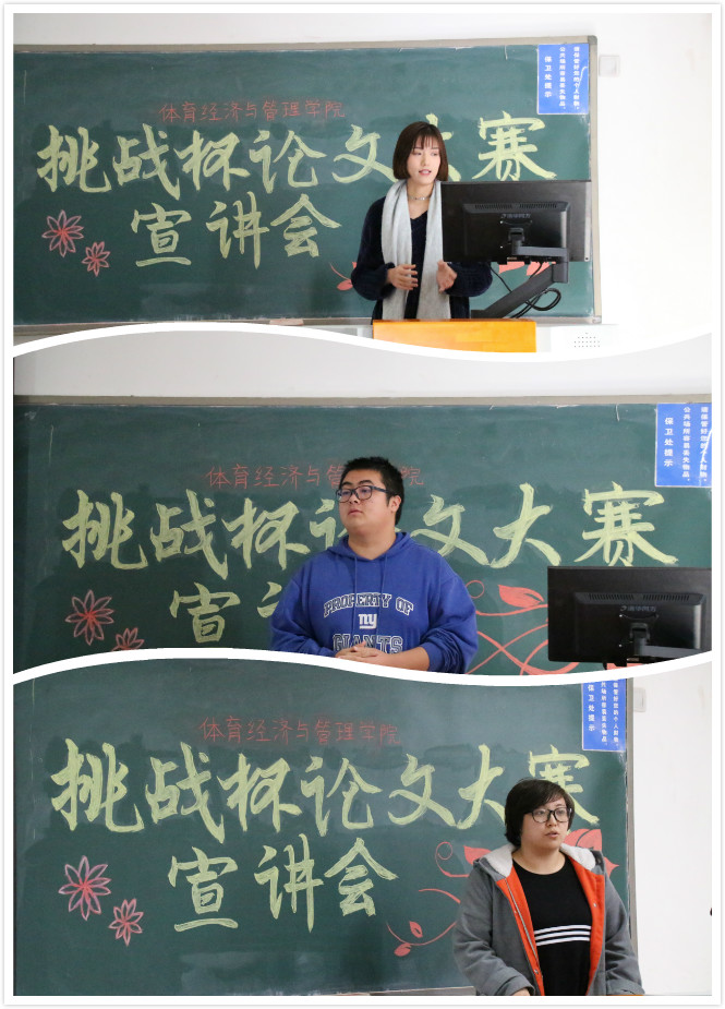 宣讲伊始,学术实践部部长马枢佳同学为大家细致讲解了本次挑战杯论文大赛对于参赛论文的要求;之后刘嘉琪同学从她的参赛经历出发,就论文格式的编排、数据资料的收集、教师的指导等方面,将宝贵的经验与大家分享,阐述“从细微处看大问题”的论文写作精髓;接下来陈逸洲同学以他曾获得挑战杯论文大赛二等奖的“CBA专业球员薪酬评价体系”研究课题为例,介绍了选题的确认要点及如何从其他论文中获取资料、数据及新的灵感来完善论文,同时陈逸洲同学还介绍了相应能实现数据处理的软件。