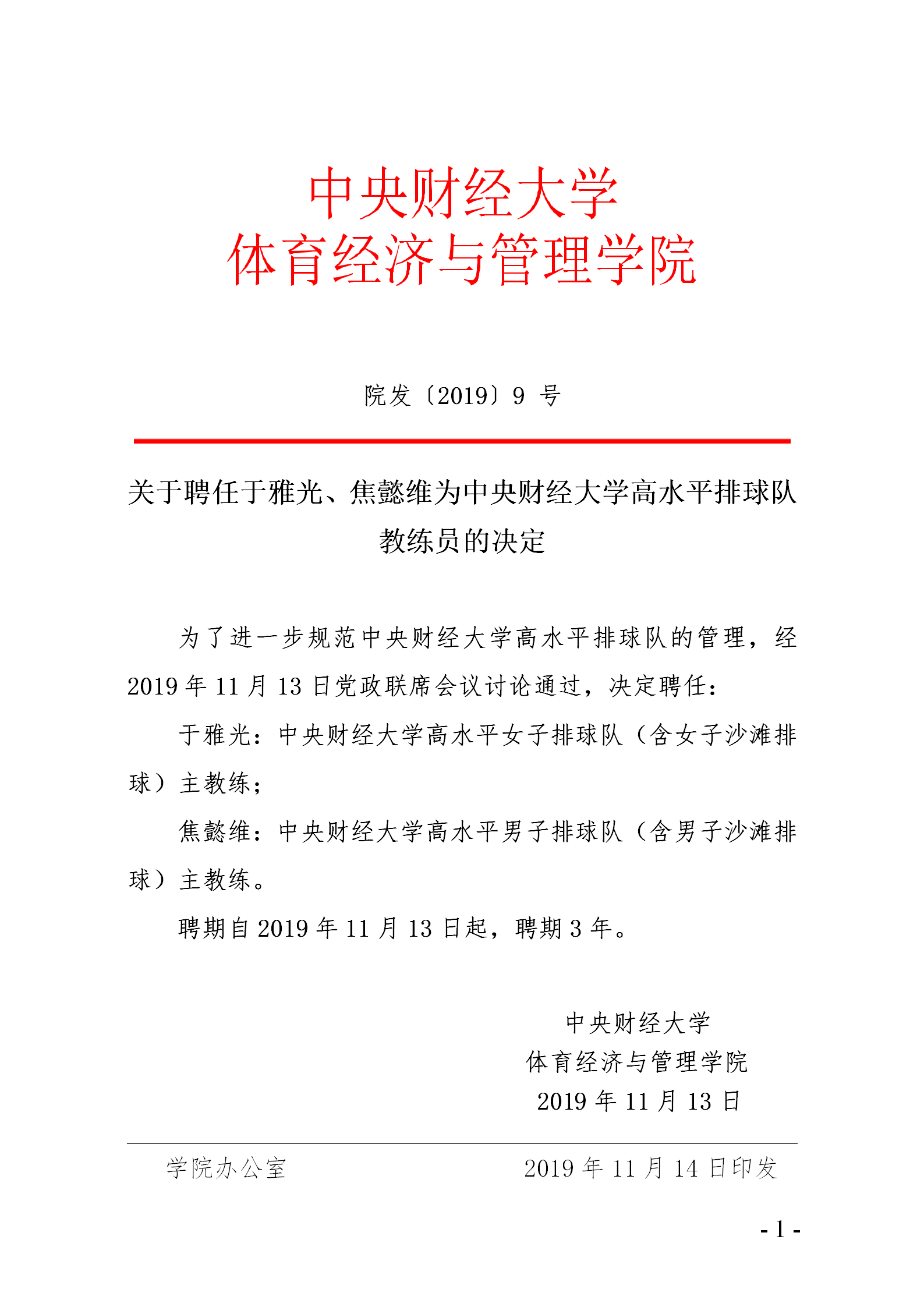 院发〔2019〕9 号 关于聘任于雅光、焦懿维为PA视讯官方网站高水平排球队教练员的决定